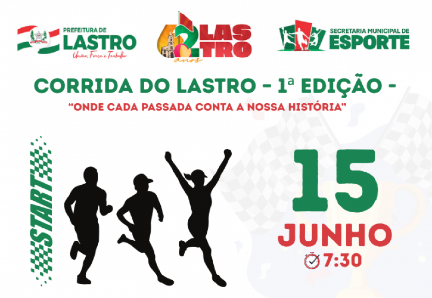 Em comemoração aos 62 anos de emancipação política da cidade de Lastro – PB, convidamos toda a população para participar da Corrida “Lastro em Movimento”. Um evento esportivo que une saúde, confraternização e amor pela nossa terra.